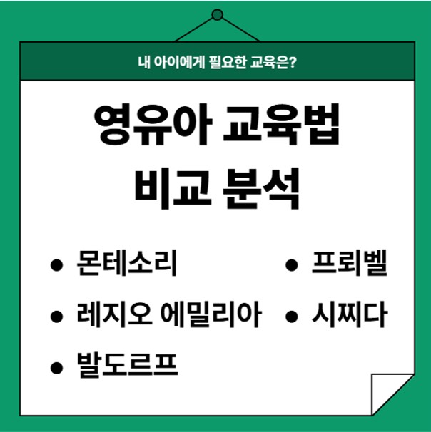 각 교육법의 철학적 배경과 특징 및 적용 연령 · 교수학습방법 · 발달 효과 · 부모 참여도 · 교육 환경 구성 측면에서 비교함으로써 영유아기 교육 선택에 대한 기준을 세울 수 있습니다. 각각의 비교표는 하단에 있습니다.
