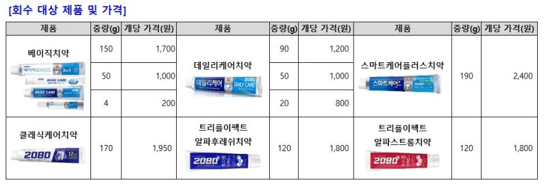 • 리콜 대상 치약은 즉시 사용 중단 권장