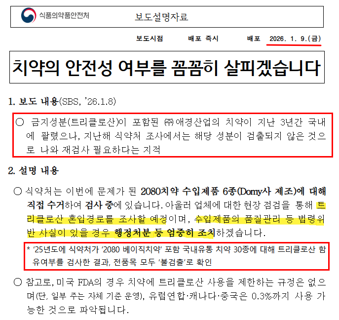✔ 2080 치약 리콜은 해당 성분 검출로 인한 조치