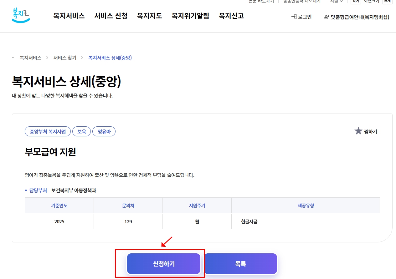 경로: 복지로 로그인 → 서비스 신청 → 복지서비스 신청 → 복지급여 신청 → 영유아 → 부모급여(현금)